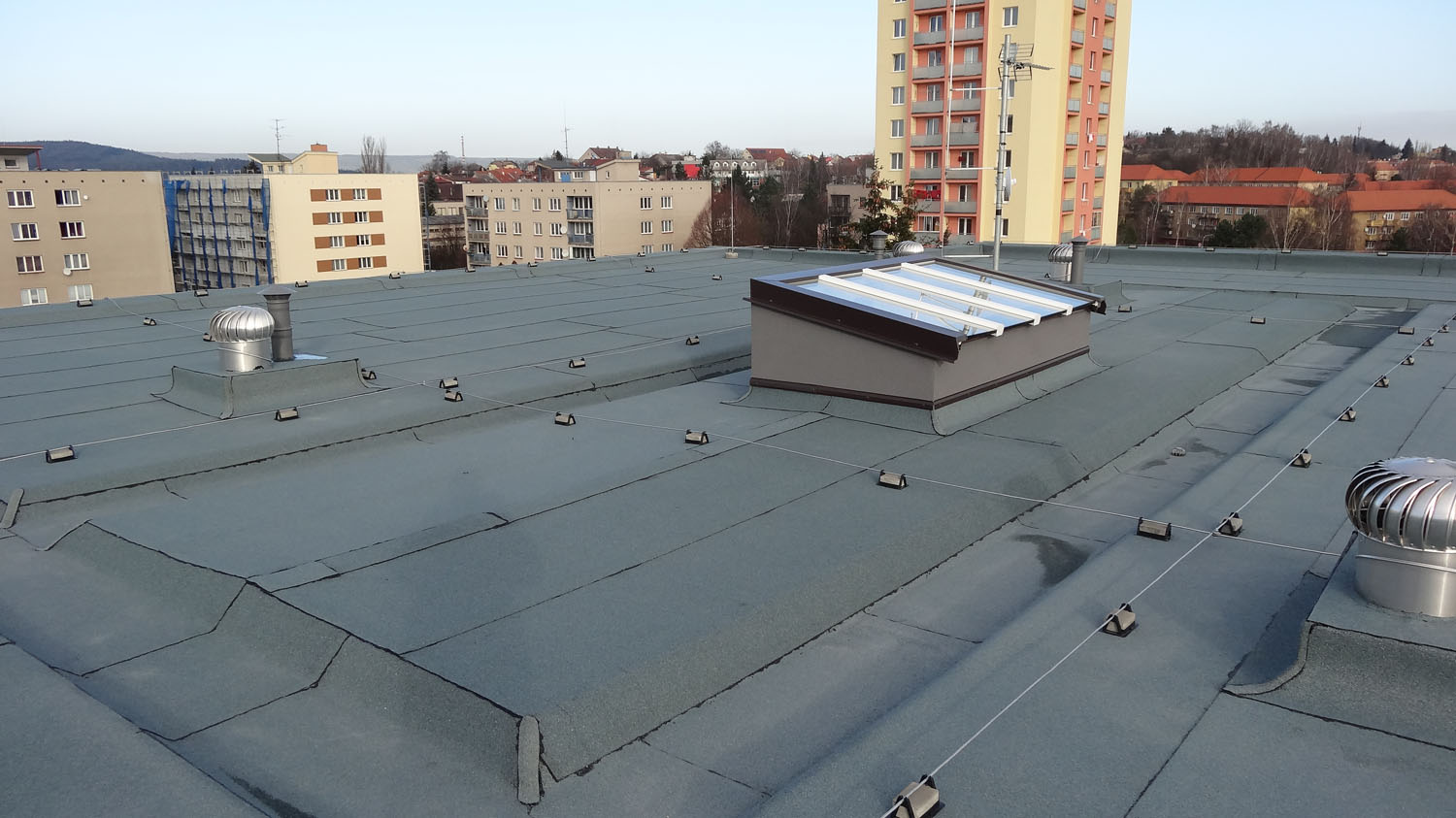Střechu realizujeme jako kompletní dodávku samočinným odvětrávacích hlavic, montáží a revizí hromosvodů, střešních výlezů a souvisejících klempířských prvků